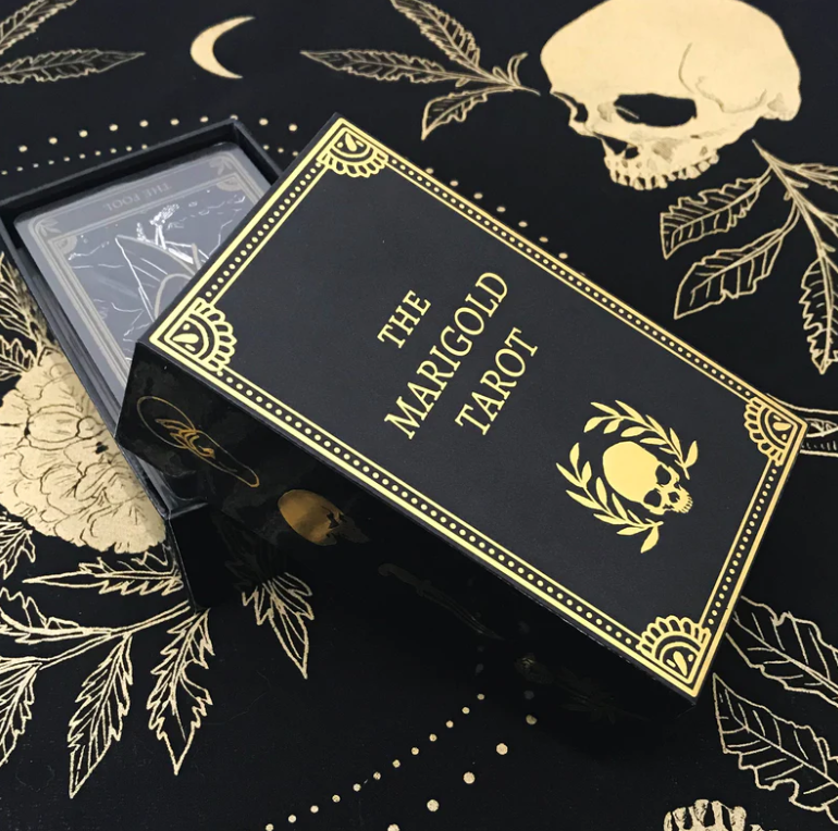 Third Print Edition. Featuring gold-gilt edging on the sides of the cards - now includes a matte-black pocket guidebook/"LWB". A 78-card tarot deck rooted in life, death, and gold. Draws references from anatomy, nature, and distinctly Punjabi imagery. Illustrated by Amrit Brar. Printed hardcover copy of the guide sold separately. 78-card tarot deck Matte-black pocket guide/"LWB" Minor Arcana pip cards Fully illustrated court cards Fully illustrated Major Arcana 310GSM Germanblack-core, linen finish playing card stock Standard tarot card size at 2.75"x4.75" Metallic gold ink printing featured on cards (not foil) 2-piece foil-stamped nested box