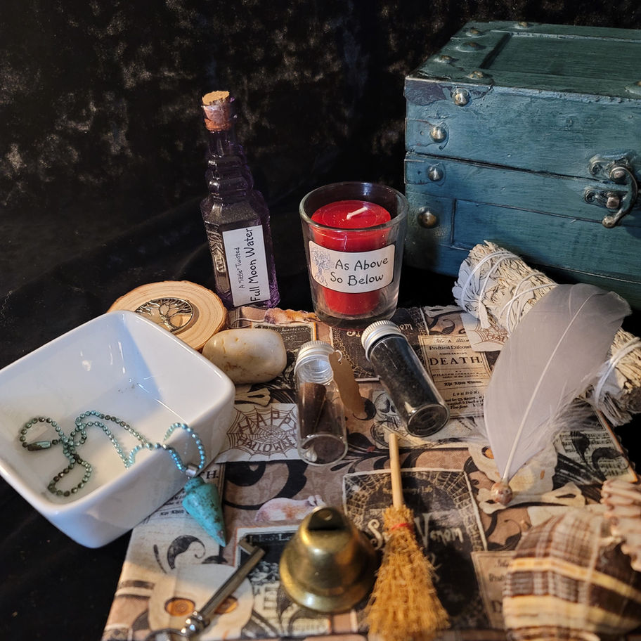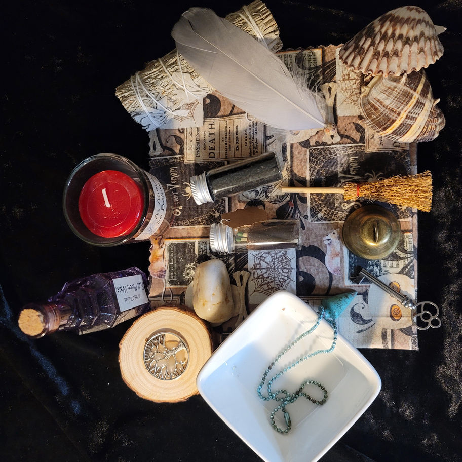 Each Travel Altar is put together by hand. Items include * Healing - Incense * Alter Cloth * White Sage Smudge Stick - Cleansing your space * Goose Feather Smudge Fan - Air / Wind w/ Soapstone Amber embellishment * Seashells - Water * Candle - Fire (Black - absorption of negative energy) * River Rock - Earth from the Russian River Calif * Broom - Sweep away stagnant energy * Black Salt (Witches’ Salt) - Drive away evil & negative energy * Pendulum - Turquoise Howlite (Release) * Porcelain Offering Bowl * Birch Altar Disk - Tree of Life * Full Moon Water- 11/19/2021 (Lunar Moon) * Brass Claw Bell * Key - protection & they symbolize Hekate and the Upper World of wisdom and mystery ***** Please read, Kits may vary. Incense, Candle Color, Altar Disk, Moon Water Date and Pendulum change with each kit. The box pictured is not included. ***** Link to Trunk Box