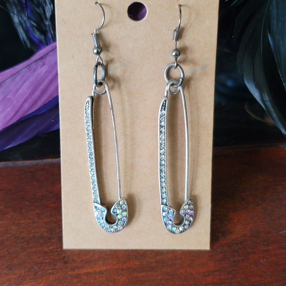 Create a unique accessory statement with Safety Pin Pendants with Gems! Shaped like classic safety pins, these metal earrings offer iridescent gems that will add a subtle little sparkle to your style. Reliable material: Quality Material: Crafted with zinc alloy that is both lead and nickel free, reliable in quality, and not easy to fade and deform, which are firm and not easy to break, you can use it for a long time. Length: 2" Width: 7/16" Thickness: 1/8" Metal Color: Silver Ox ~ All of my Earrings are Lead and Nickle FREE. I use Stainless Steel Hook for all of them including earring backs. ~