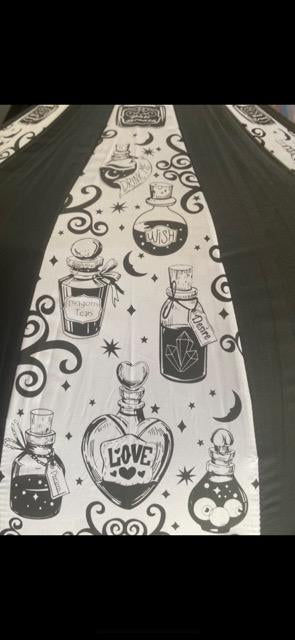UMBRELLA B/W SPELLS AND POTIONS UMBRELLA B/W SPELLS AND POTIONS. And features lace and bow details and hook-style handle. Whether it is Sunny or Wet, this is a must-have accessory for all your weather needs (yes, that’s right- this is a real umbrella and can get wet. It’s not just a fashion piece, it’s functional)! This Umbrella will complement any outfit or costume.